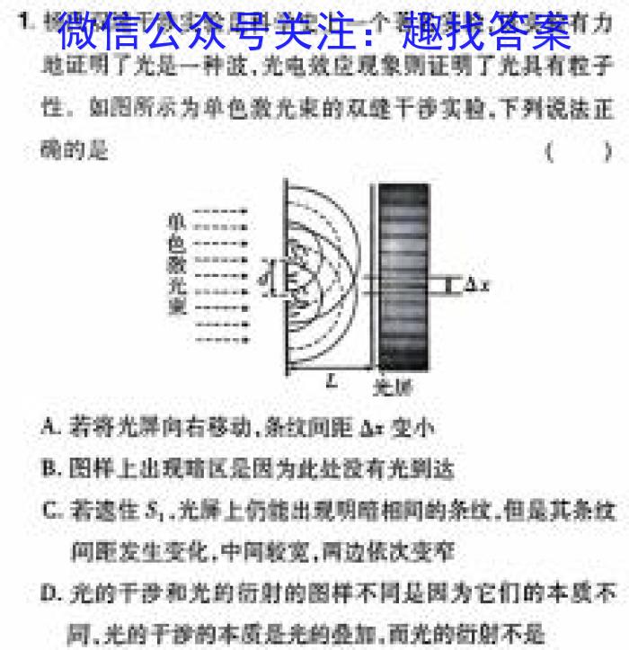 1.扬氏双烧干涉实验是科学史上一个著名实验,该实验有力地证明了光是一种波,光电效应观象则证明了光具有粒子性,如图所示为单色激光束的双缝干涉实验,下列说法正确的是()A.若将光屏向右移动,条纹间距变小B.图样上出现区是因为此处没有光达C.若速住S1,,光屏上仍能出现明暗相阿的条纹,但是其条纹问距发生变化,中间较宽,两边依次变率D.光的干涉和光的衍射的图样不同是因为它们的本质不同,光的干沙的本质是光的叠加,而光的衍射不是
